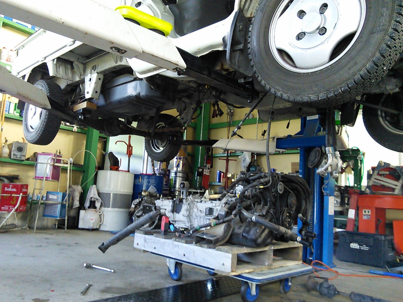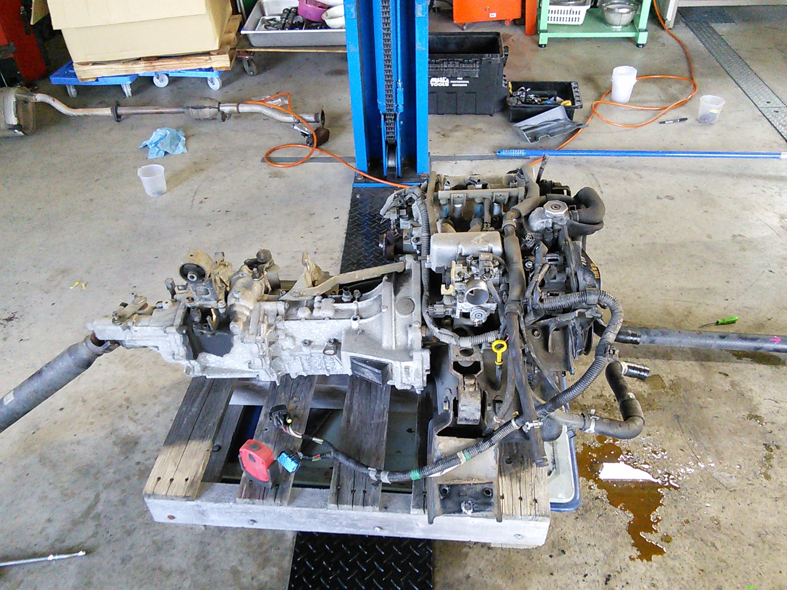 今 作業中のエンジン交換。ミッションも一緒に降ろして